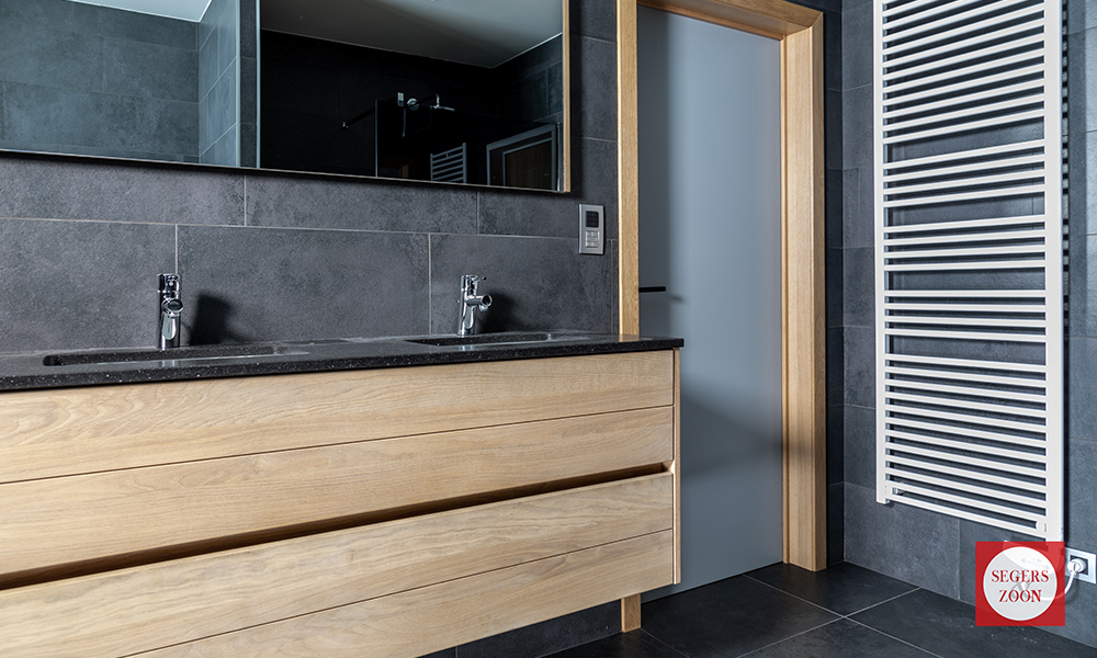 Ook in de badkamer wou deze klant iets moderner gaan maar toch strak en landelijk. Hiervoor werd de keuze gemaakt van een grijze laminaatdeur met eiken omkasting en omlijsting. Voor de glazen deur werd een zwart beslag voorzien met eiken omkasting en omlijsting.